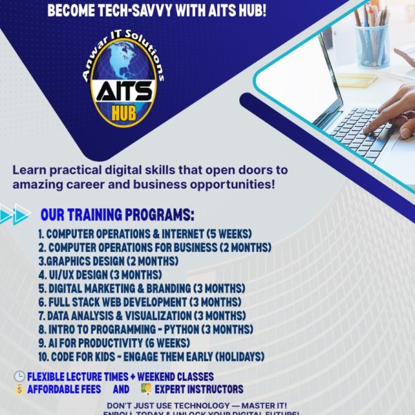Anwar IT Solutions Hub Has opened Application for Digital Skills Training for the Year 2026 The Training Include areas such ... Read More